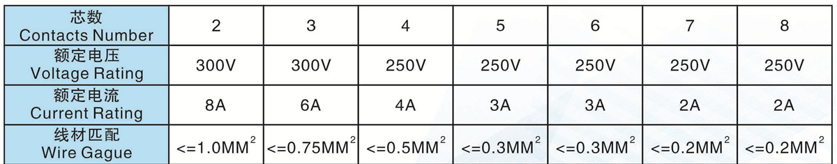 線材匹配(Wire  Gague):<=1.0MM2       <=0.75MM2       <=0.5MM2      <=0.3MM2        <=0.3MM2        <=0.2MM2        <=0.2MM2
