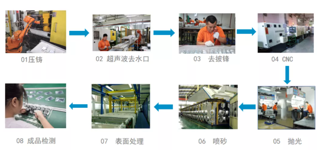 05、壓力壓鑄技術(shù):將熔融狀態(tài)或半熔融狀態(tài)合金澆入壓鑄機的壓室,在高壓的作用下,以極高的速度充填在壓鑄模的型腔內(nèi),并在高壓力下使熔融合金冷卻凝固成型的高效益,高效率的精密壓鑄。
