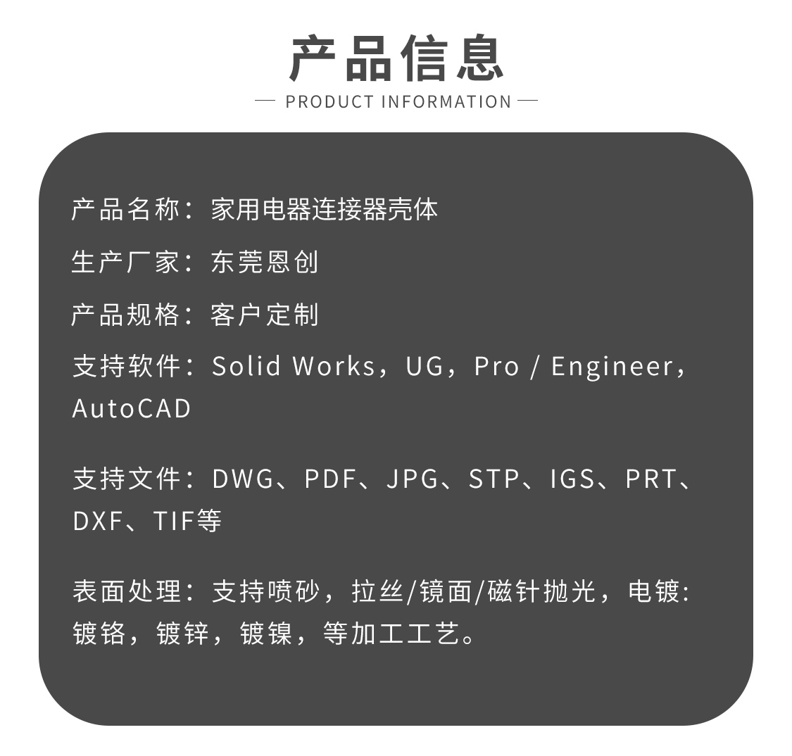 東莞恩創(chuàng)精密,鋅合金壓鑄廠家,20臺300噸鋅合金壓鑄機(jī)臺,服務(wù)于全球多家知名廠商,連接器外殼,新能源連接器外殼壓鑄件,公差可達(dá)正負(fù)0.002.鹽霧測試最高可達(dá)720小時,貫穿孔精度全部使用CCD全檢.