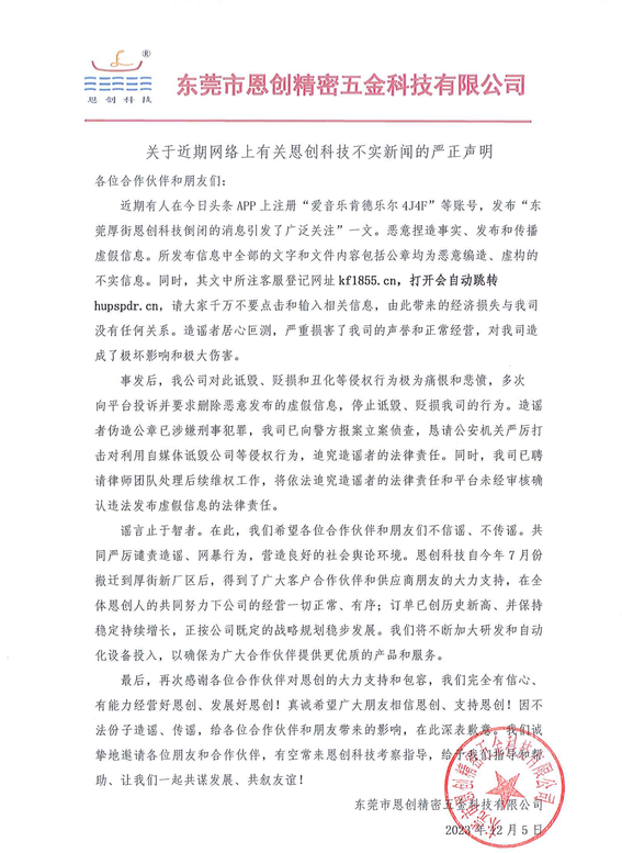 謠言止于智者。在此,我們希望各們合作伙伴和朋友們不信謠、不傳謠。共同嚴厲譴責造謠、網暴行為,營造良好的社會輿論環境。恩創科技自今年7月份搬遷到厚街新廠區后,得到了廣大客戶合作伙伴和供應商朋友的大力支持,在全體恩創人的共同努力下公司的經營一切正常、有序;訂單已創歷史新高、并保持穩定持續增長,正按公司既定的戰略規劃穩步發展。我們將不斷加大研發和自動化設備投入,以確保為廣大合作伙伴提供更優質的產品和服務。我們非常珍惜與您長期合作建立起的友好合作關系。