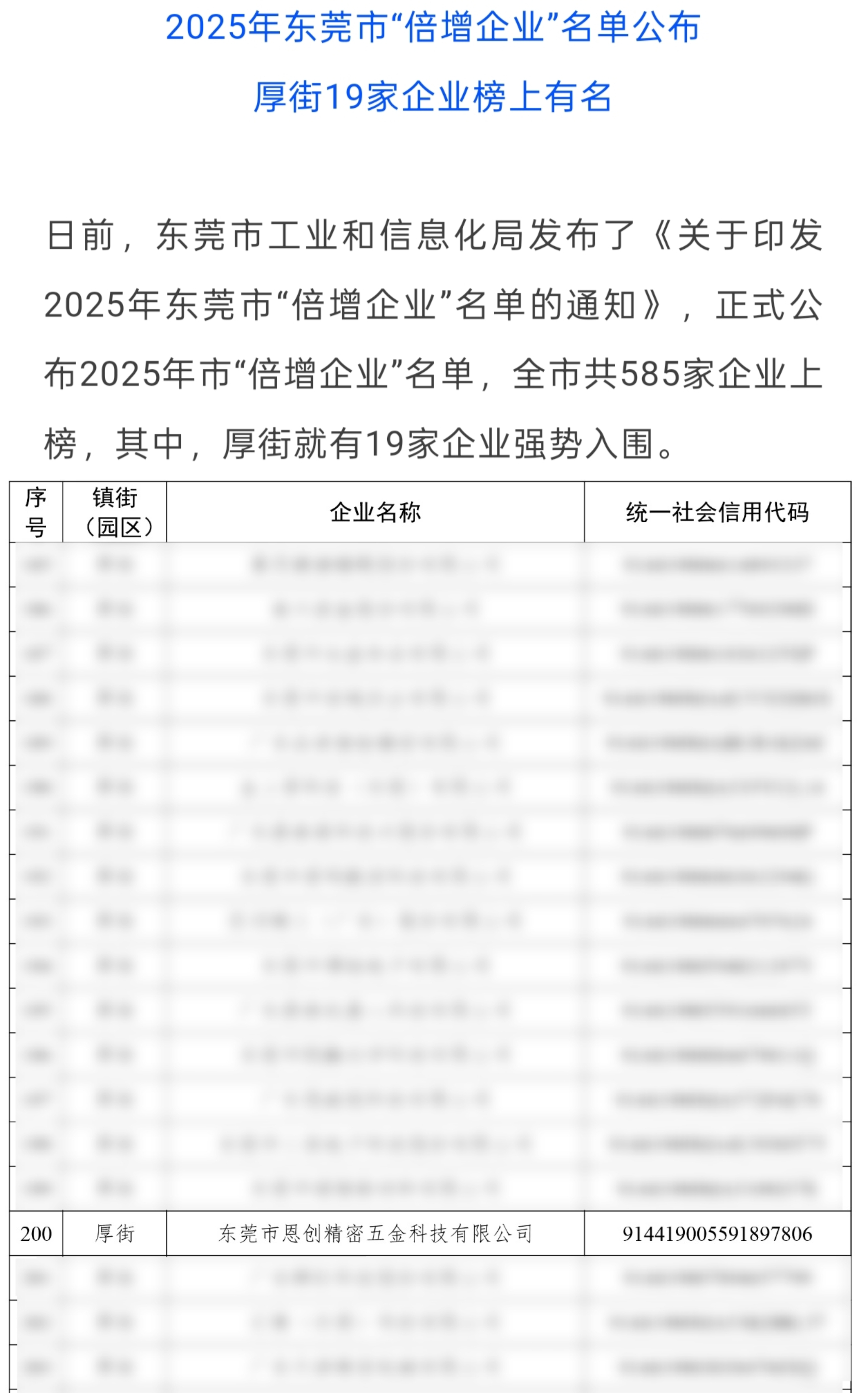 今日,我們懷著無比激動的心情,向全體同仁、合作伙伴及社會各界朋友宣布一個重磅喜訊:恩創科技憑借在精密壓鑄領域的卓越實力與突出貢獻,成功入選 “東莞市倍增企業” 名單!這份榮譽,是市政府對我們過去努力的高度認可,更是對恩創科技未來發展潛力的深切期許。