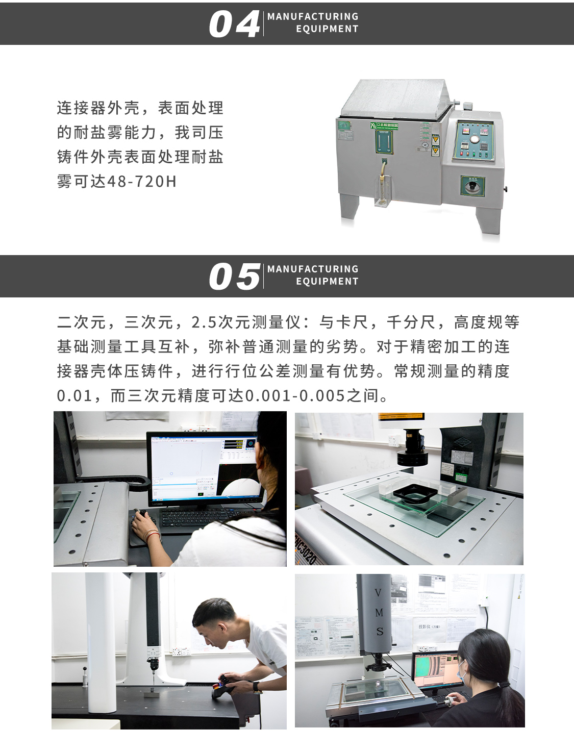 公司設(shè)備優(yōu)勢(shì):自動(dòng)化生產(chǎn)機(jī)器設(shè)備、壓鑄機(jī)配有ABB機(jī)器人,CCD檢測(cè)設(shè)備,二次元,三次元,2.5次元,膜厚儀等檢測(cè)設(shè)備,以及鹽霧測(cè)試機(jī)。